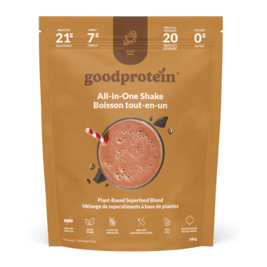 Protein blend (pea protein, milled golden flaxseed), Soluble tapioca fibers, Coconut milk powder* (coconut milk powder*, tapioca maltodextrin*, acacia gum*), Natural flavours, Alkalyzed cocoa powder, Acacia gum, Guar gum, Xanthan gum, Decaffeinated soluble coffee, Medium chain triglycerides (medium chain triglycerides from coconut oil, acacia gum), Fruits, vegetables and mushrooms blend (broccoli, spinach, kale, pumpkin, sweet potato, sunflower seed, cranberry, chlorella, maitake mushroom, shiitake mushroom, pomegranate juice powder*, acai juice powder*, goji juice powder*, grape juice powder*, amla fruit powder*, aronia powder*, sea buckthorn juice powder*, camu camu powder*, acerola juice powder*), Rebaudioside M, Salt, Bacterial culture and enzymes blend (rice maltodextrin, Bacillus subtilis, amylase, protease). *Organic ingredients May contain: soybeans, eggs, peanuts, tree nuts, sesame, and fish. Produced in a facility that also processes wheat and milk. Good Protein follows strict allergen management protocols in all of Good Proteins' manufacturing facilities.