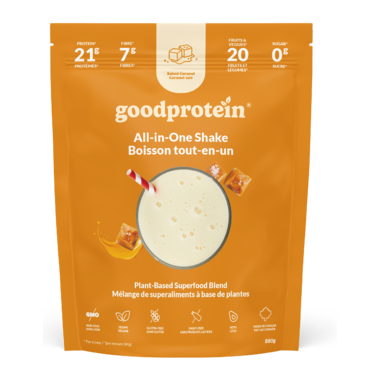 Protein blend (pea protein, milled golden flaxseed), Natural flavours, Soluble Ingredients: tapioca fibers, Coconut milk powder* (coconut milk powder*, tapioca maltodextrin*, acacia gum*), Medium chain triglycerides (medium chain triglycerides from coconut oil, tapioca maltodextrin), Acacia gum, Guar gum, Xanthan gum, Salt, Fruits, vegetables and mushrooms blend (spinach, broccoli, carrot, sweet potato, orange, apple, strawberry, sunflower seeds, shiitake mushroom, maitake mushroom, pomegranate juice powder*, acai juice powder*, goji juice powder*, grape juice powder*, amla fruit powder*, cranberry powder*, aronia powder*, sea buckthorn juice powder*, camu camu powder*, acerola juice powder*), Rebaudioside M, Beta-carotene, Beetroot colour, Bacterial culture and enzymes blend (rice maltodextrin, Bacillus subtilis, bromelain, papain). *Organic ingredients