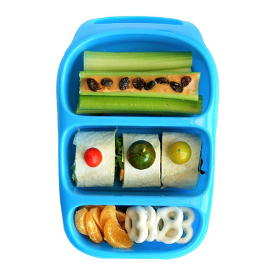Top container: Perfect for leftovers, a sandwich, sliced apples, oranges, even a banana. Middle compartment: Fits the eight-ounce drink bottle on its side (sold separately), or additional food. Bottom container: Fits sandwich halves, bagel, pasta salad, chips, yogurt or cereal.