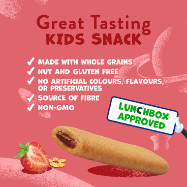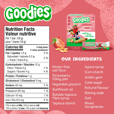 Gluten free oat flour, strawberry filling jam (cane syrup, sugar, glycerin, seedless strawberry puree, modified food starch, citrus fibre, natural flvour, salt, purple carrot juice concentrate, water, citric acid, turmeric), Vegetable glycerin, Sunflower oil, Soluble tapioca fibre syrup, tapioca starch, agave syrup, corn starch, Arabic gum, cane sugar, natural flavour, baking soda, Mixed tocopherols.