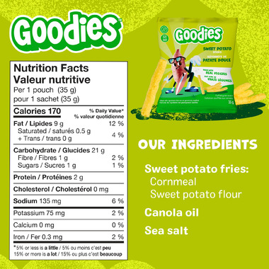 Sweet Potato fries (cornmeal, sweet potato flour), Canola oil, Sea salt.