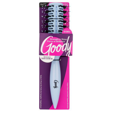 The barrel of the Goody Go Gentle Strength Infusion Round Brush has built-in strips infused with black castor oil to help moisturize and strengthen strands as you brush. Its vegan boar bristles are flexible as they glide through hair to distribute oil from roots to ends.