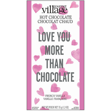 Gourmet du Village Mini Hot Chocolate Mixes for single servings. Enjoy this "Love You More Than Chocolate" french vanilla hot chocolate mix. Made in Canada.