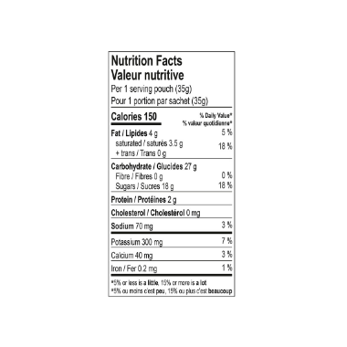 Sugars (sugar, corn syrup solids), Modified milk ingredients (whey protein concentrate, dairy product solids, sodium caseinate), Coconut oil, Maltodextrin, Instant coffee, Dipotassium phosphate, Mono- and diglycerides, Artificial flavour, Silicon dioxide, Turmeric, Annatto.