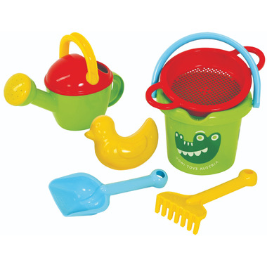 This set should not be missing in any sandpit! Consisting of a bucket, shovel, rake, sand mold, watering can and sieve, the little sandpit fans leave nothing to be desired. Creativity can thus be given free rein. The different colored parts are optimally designed for children's hands and are not too heavy. Furthermore, the various components are very robust and stable.The bucket has a capacity of 1.5 liters, the watering can over 0.5 liters.