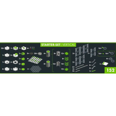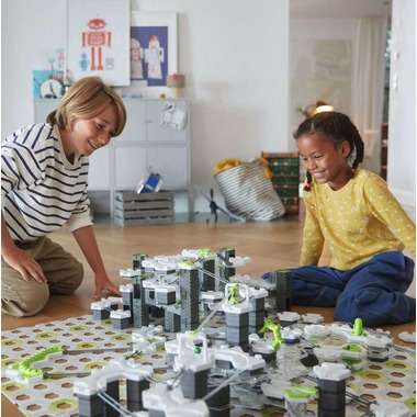 Comes complete with instructions, plans booklet and 153 pieces: 6 metal marbles, 4 rugged 12 x 12 card bases, 1 transparent level, 20 large/9 small height tiles, 18 tracks (3 long, 6 medium, 9 short), 1 Magnetic Cannon, 28 curves, 4 X-intersections, 1 vortex, 2 Y-intersections, 1 launcher, 1 finish line, 1 3-in-1 tile, 2 switches, 4 bases for inserts (2 catchers, 1 freefall, 1 splash, 1 landing), 8 pillars, 4 tunnel pillars, 5 walls (2 long, 2 medium, 1 small), 16 balconies, 4 double balconies. Lasting durability for girls and boys ages 8 and up, its the learning toy children (and savvy adults) return to over and over again! Contents 2x Sets of Instructions, 4x Card Bases, 1x Transparent levels, 6x Gravity Spheres, 3x Long Rails, 6x Medium Rails, 9x Short Rails, 1x Magnetic Cannon, 28x Curved Bases, 4x X intersection Bases, 1x Vortex Base, 2x Y Points Bases, 1x End target, 1x 3in1 Base, 4x Bases for inserts, 1x 3 Way Starter Base Insert, 2x Catcher Base Inserts, 2x Switches, 1x Base Insert, 1x Free Fall Base Insert, 20x Large Vertical Tiles, 9x Small Vertical Tiles, 8x Pillars, 4x Tunnel Pillars,2x Walls Long, 2x Walls Medium, 1x Wall Small, 16x Balconies, 4x Double Balconies.