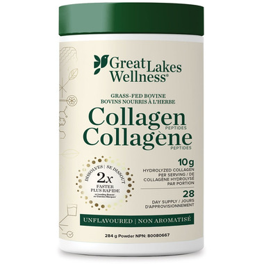 Feel the glowing benefits with Great Lakes Wellness Collagen Peptides. Containing 10g of grass-fed hydrolyzed collagen and 9g of protein per serving, this collagen dissolves 2x faster vs leading brands, with no clumps, taste or smell. Easily digested and absorbed by the body. 10g of grass-fed collagen per serving.