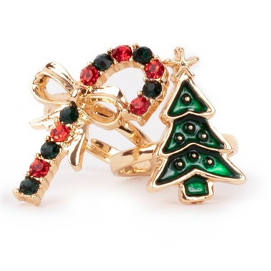 Get into the festive spirit with the All Aglow Holiday Ring Set! This set includes a charming candy cane ring adorned with alternating green and red gemstones, complemented by a stunning gold bow. Additionally, you'll find a matching green Christmas tree ring that adds a touch of holiday cheer to any outfit.