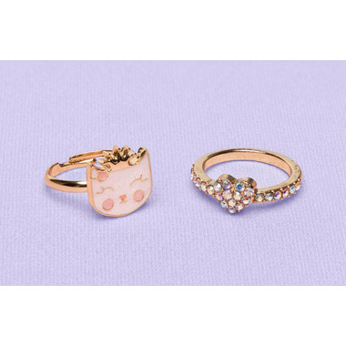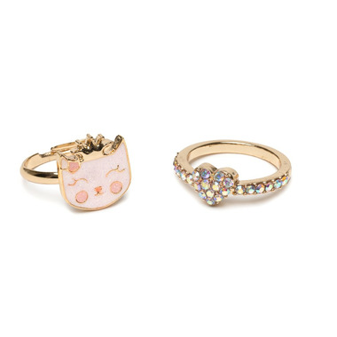 This adorable Boutique Kitty Love Ring Set includes one pink kitty ring and one rhinestone encrusted heart shaped ring, perfect for adding a touch of charm to any outfit.