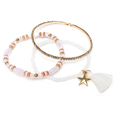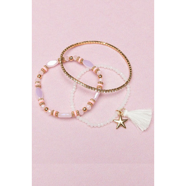 Adorable Set of 3 Rising Star Bracelets in white and golden colours, and adorned with star and white tassel charms! This is a fun and elegant set of bracelets for your little one to love for many years to come!