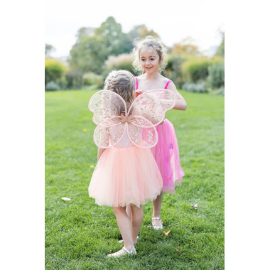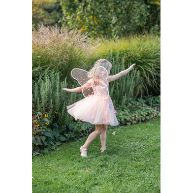 Let imaginations take flight with these adorable Butterfly Bliss Wings in Peach! These dreamy wings feature a soft peach hue with a sheer, lightweight design. Scattered golden glitter leafs add a magical sparkle with every twirl, while a delicate gold butterfly sits at the center for the perfect finishing touch. Stretchy arm loop elastics make it easy for little butterflies to slip on and flutter off into make-believe!