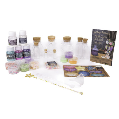 The Great Pretenders Mystic Potion Kit comes with 30 amazing pieces to experience making unforgettable mystical creations! Perfect to play on your own or with your friends, this set includes empty jars with lids, sparkles, and jars of mica powder stardust in different colours, gems, and jars with large chunky glitter in different shapes and colours, spoons and mixing wands, stickers and labels, and so much more! Also included is the Magic Academy’s Mystic Spells & Potions Texbook to inspire your creative adventures!