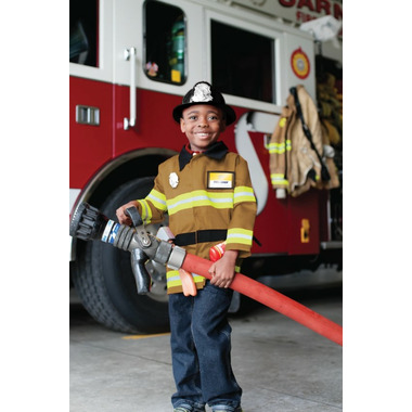 Sound the alarm and suit up to fight pretend fires in this fully geared firefighter outfit! Look the part in this complete 5-piece dress-up-and-play set. The set includes a tan coat with reflective tape details, plastic firefighter hat with emblem, removable personalized name badge, play axe, and play fire extinguisher (which is actually a water gun!). The coat even comes with the matching plastic firehouse badge. All Great Pretenders Career Costumes are packaged in a reusable garment bag for easy storage. The jacket is machine washable, and this five-piece set includes: coat, helmet, axe, fire extinguisher and badge.