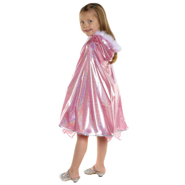 This beautiful cape is made with lush fabric that has stretchy and fluid feel, and with shimmering and sparkling effects of pink colour and overall its a sweet and whimsical design. This charming cape is trimmed with silver bias for more glimmer and glamour! The hood is sized to drape nicely over the head and is trimmed in soft white marabou. The neck fastens with a hook and loop closure and features a large gem and satin bow, and its machine washable!