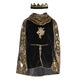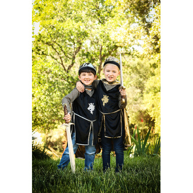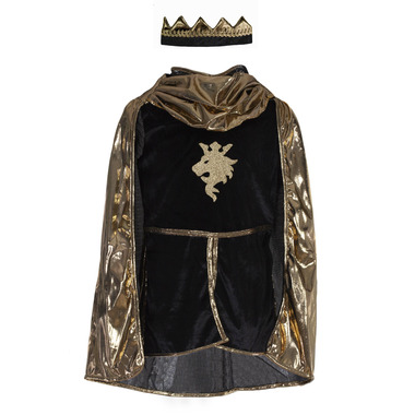 Be off to fight the good fight with this amazing 3 piece gold hooded knight set. This set includes a hooded tunic, knight cape and gold or silver knight crown. A glitter lion emblem is embellished on the front of a black velour tunic with chainmail-like fabric for the hood and long sleeves. The hook and loop closure on and off cape made out of gold or silver liquid knit adds to complete the outfit. Plus don't forget the last piece, the matching knight crown trimmed with gold or silver detailing!