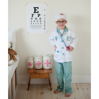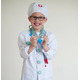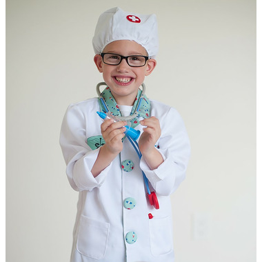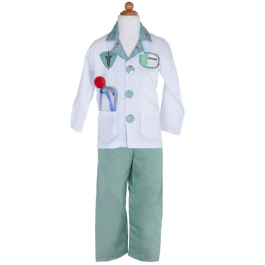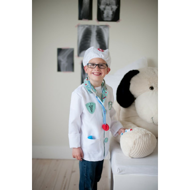 Set Includes: Lab coat, pants, mask, hat, stethoscope, syringe, name tag and thermometer.