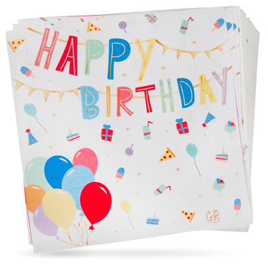 Celebrate your birthday in style with these Happy Birthday themed Party Napkins. They are 5” x 5”, and come in a pack with 20 pieces. They are the perfect party ware with their elegant look of bright and cheerful designs with Happy Birthday message, balloons, and a great collection of party themed icons.