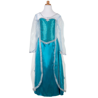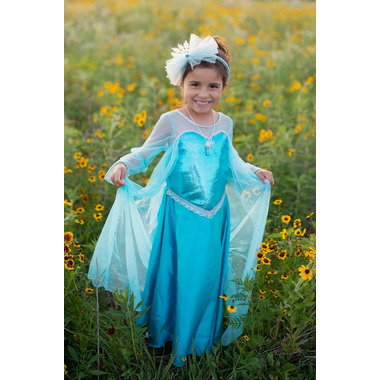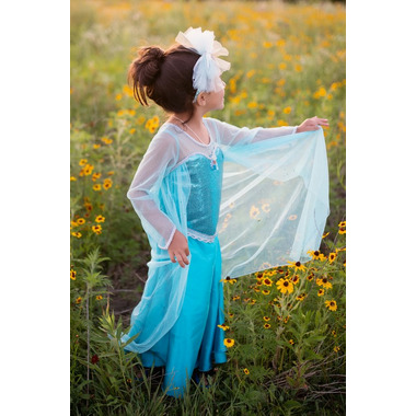 Turn your little princess into the Ice Queen in this gorgeous full length aqua blue dress. Sheer mesh textile is used for the sleeves and the dramatic train. Features a sequin sweetheart bodice, satin skirt, and fancy silver trims beautifully finish off the entire dress. The long trailing cape and the sleeves are frosted with silver sparkles, and the sequinned bodice is adorned with a gem studded snowflake.