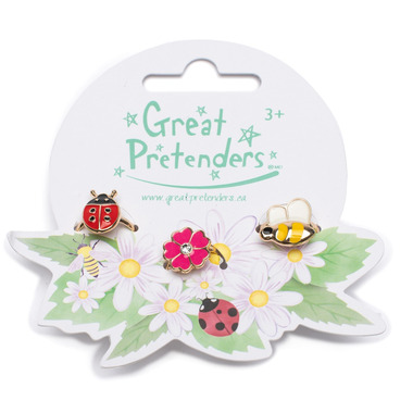 Great Pretenders Ladybug Garden 3-piece Ring Set features adjustable ladybug, bumblebee, and a flower ring! These sweet and charming designs are sure to delight all little ladybug and bumblebee fans for the years to come!