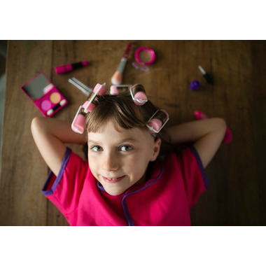 Make-Up Artist Set Includes 9 Accessories and Size 5-6 makeup artist lab cat. This is the perfect set for all little ones who love to play makeup artist and its very safe to play with because all accessories are pretend play pieces with no spilled powders or lipstick stains! The set includes a Machine Washable Lab Coat, an Accessory Belt with a pouch to store your play pieces, Lipstick, Nail Polish, Eye Shadow, a Glitter Hairbrush, a Makeup Brush, Curlers, and a Comb. Destined to become one of childhood's favorite pretend play costumes, this set is a must in all dress up trunks for little ones who love to play make up without any mess!