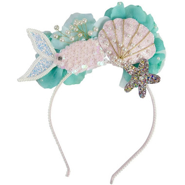Mermalicious and delicious! This headband sparkles and shines with sequins and peals, glitter and glam, silver and gold, and absolutely gorgeous ocean turquoise backdrop featuring all these amazing and intricate decals!