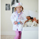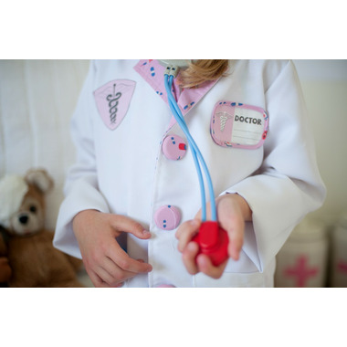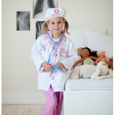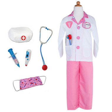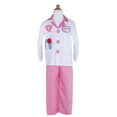 The doctor is in! Look the part in this complete ensemble as you diagnose and treat your little patients with this 8-piece dress-up-and-play set. The set includes a white labcoat with pink detailing, pink scrub pants, a pink fabric mask, a white hat, a play stethoscope, a play syringe, and a play thermometer. The coat also features a sewn-in doctor's name tag holder with a removable name tag. All Great Pretenders Career Costumes are packaged in a reusable garment bag for easy storage. 8-Piece Set: Lab coat, pants, mask, hat, stethoscope, syringe, name tag and thermometer. Garments are durable and machine washable, wipe-clean accessories.
