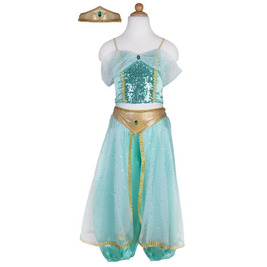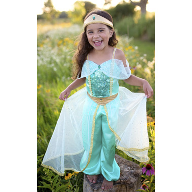 Jasmine's magical adventures begin with this gorgeous, premium quality 3-piece pant set in vibrant turquoise tones and contrasted with fancy golden trims. Satin pants have a gold liquid knit belt adorned with a shiny emerald gem, and a sequined tulle overlay trimmed with fancy metallic golden trims. The top features satin bodice, emerald-coloured sequined inset, gold elastic straps, and its adorned with off the shoulders tulle collar with a green emerald gem. This set comes with a liquid knit gold headpiece accented with fancy golden trim and an emerald gemstone.