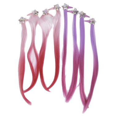 This set comes beautifully presented in a gift box and includes 8 vibrant hair extensions, perfect for adding flair to any look. The set features 4 Ombre Pink Extensions: Starting with a soft light pink at the top and transitioning into a bold hot pink at the bottom for a stunning, eye-catching effect. And, it features 4 Ombre Purple Extensions: Beginning with a rich purple hue at the top and blending seamlessly into a vibrant pink, creating a smooth gradient of color. Each extension is finished with a sparkly sequin star hair clip at the top, adding extra shine and glamour.