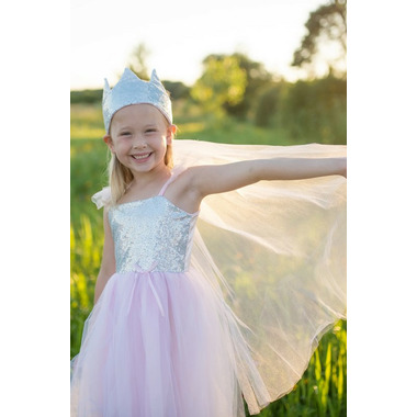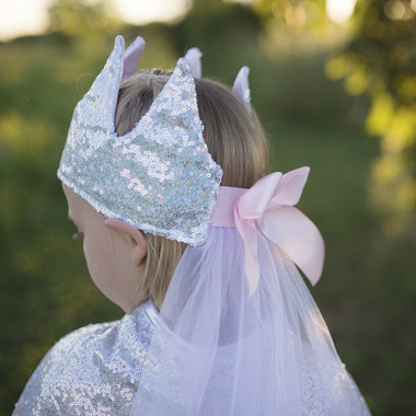 All princesses need a crown, and this one is very special because it comes with its own flowing veil! This soft-sided crown is covered in silver iridescent sequins and is lined with soft pink satin to make playtime comfortable. To top it off this crown has a beautiful long veil made of soft pink tulle. This crown is made to match the Great Pretenders Silver Sequins Princess Dress.