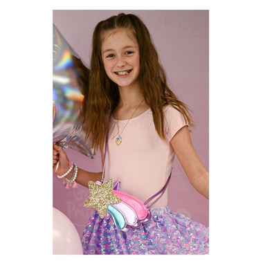 Great Pretenders Shooting Star Purse is a delightful accessory for all little superstars! This charming purse features a gold sparkle star embellishment, with vibrant pink, lilac, and blue accent shooting star design, adding a touch of magic everywhere you go! With its compact size, zipper closure, and adjustable strap, it is perfect for little hands to carry all around!