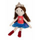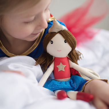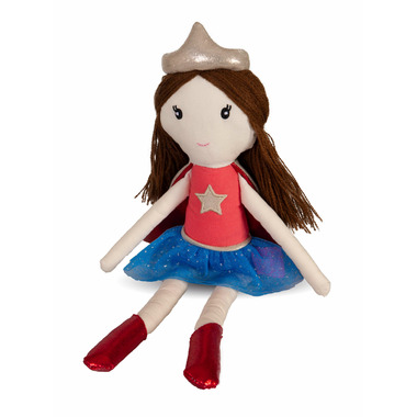 Suzie the Supergirl Doll has great superpowers and confidence, and she is the best play time companion! She is wearing a red and gold sparkle liquid knit cape with an embroidered gold star at the back and on the chest. Her skirt is made with blue tulle adorned with gold glitter sparkles, and she has shiny red boots. Golden super-headband finishes her supergirl look!