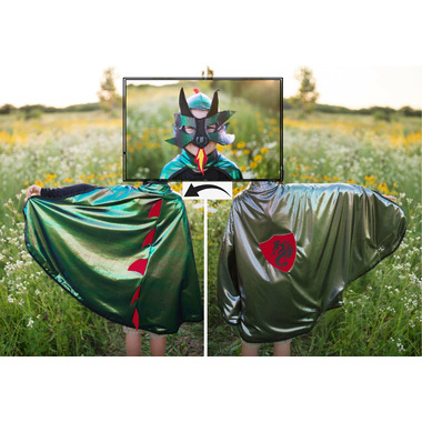 This Ultimate Reversible Dragon-Knight Cape and Mask is an incredible design featuring two characters for the price of one! Its made with beautiful quality fabrics featuring an iridescent metallic foil print on one side, and silver/black foil print on the other. Red felt accents on the spikes on the dragon side add the fiery character to this cape, and it features a dragon knight crest on the back. The mask has felt flames coming from the mouth for a super cool effect!