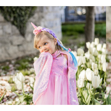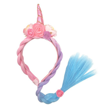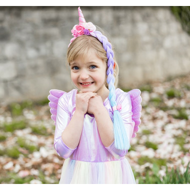 This magical Unicorn Princess Hair Braid in ombre pink, lilac, and blue colours is the perfect accessory for all princesses and fans of unicorns! Its beautifully made with high quality braid and adorned with flowers and of course a charming unicorn horn. This braid will help create magical play time and will be a big part of your little one's wonderful childhood memories!