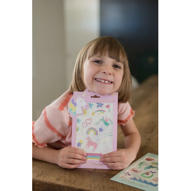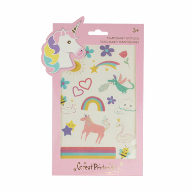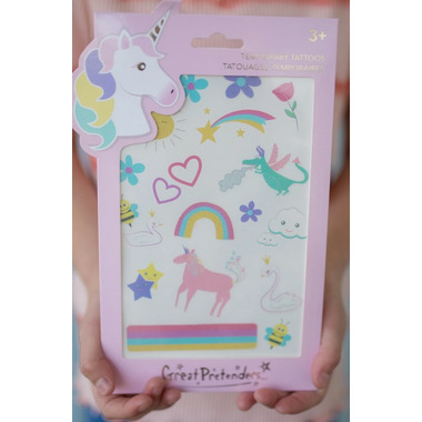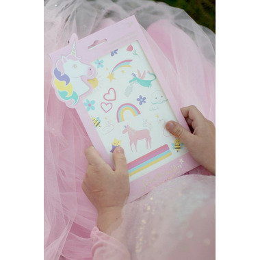 Adorable Unicorn Temporary Tattoos to transform your little one into a favourite fantasy character with 18 whimsical designs in a set, and when ready just wash them off! Beautiful high quality graphics with prints including unicorn and a dragon, rainbows and stars, flowers and bumblebee, hearts, swans, and happy clouds! They are cute, perfectly sized, and perfect for sharing!