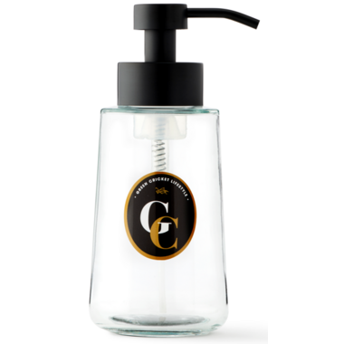 This tapered 450ml glass bottle has a black PVD coated steel pump top suitable for foaming soaps or other liquids designed for dispensing as a foam.