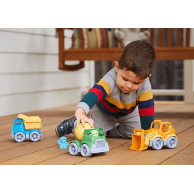 Scoop it! Mix it! Dump it! Just another earth-moving, earth-saving day at the job site for the Green Toys™ Construction Trucks! Made in the USA from 100% recycled plastic with no BPA, phthalates or PVC, the fleet includes 1 Scooper with a moveable front-loader, 1 Mixer with a revolving drum, 1 Dumper with a classic open-box bed, and 3 Construction Dogs!