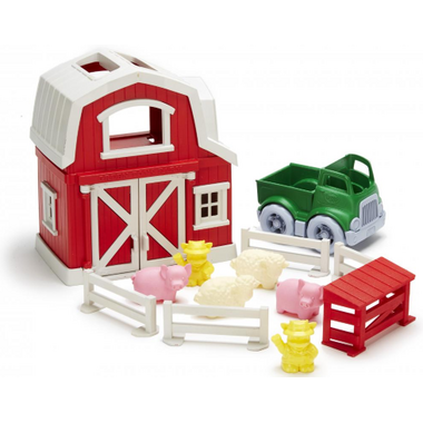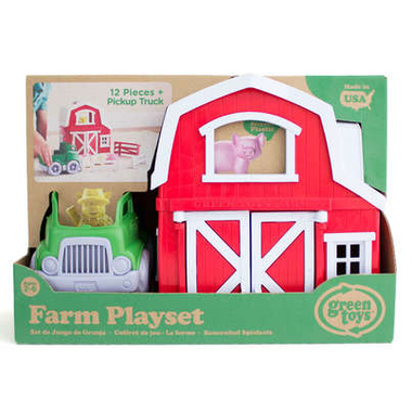 It’s a busy day on the Green Toys™ Farm! Inspiring cooperative play and communication, this playset includes a barn, pick-up truck, farmer cow characters, sheep, pigs, fences, and a hog shed for endless imaginative play. As little ones help the farmer cows open and close the barn doors, corral the pigs, and load the sheep in the back of the pick-up truck, they also develop fine motor skills and coordination. All pieces fit inside the barn, so clean-up and storage is a breeze, and the built-in handle makes it easy to take all the fun on-the-go. Made in the USA from 100% recycled plastic with no BPA, phthalates, or PVC. Dishwasher safe. Packaged with recycled and recyclable materials printed with soy inks.