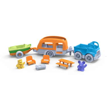 Time to hit the road! The Green Toys™ RV Camper Set is loaded up and ready for an adventure! This colourful, 3-in-1 vehicle playset has something for everyone, featuring a pick-up truck, spacious camper, and sport boat with it’s very own trailer. Play with them individually, or link them all together for two feet of fun! And don’t forget the accessories – two characters, two chairs, a picnic table, and a camping stove round out this 10 piece set with endless narrative play possibilities. Great for indoor and outdoor play, the super-safe design has no metal axels or exterior paints or coatings. Made in the USA from 100% recycled plastic with no BPA, phthalates, or PVC. Packaged with recycled and recyclable materials printed with eco-friendly inks. For ages 2 and up.