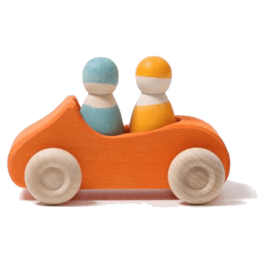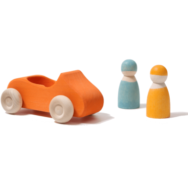 Large Orange Convertible Car also includes 2 Peg Dolls. Grimm's captivatingly simple and off-road wooden convertible car can take 2 Rainbow Friends on a jaunt into the countryside. Afterward, the vehicles do not have to go into the car wash, but can simply be cleaned with a damp cloth. Car length 13 cm. Made with European-sourced lime wood, non-toxic water based color stain