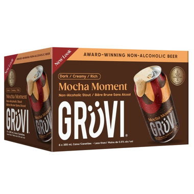 Gruvi's Mocha Nitro Stout contains less than 0.5% alcohol, 100% beer. Contains only 80 calories. Brewed in Toronto. Comes in a pack of 6.