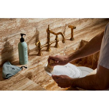 Infused with plant-based ingredients and mild surfactants, this dish soap boasts a delightful scent profile in Guests on Earth's signature Citrus Oasis essential oil blend. Each washing experience will unveil top notes of tangerine and peppermint, middle notes of rosemary and lavender, and base notes of cedarwood and fennel.