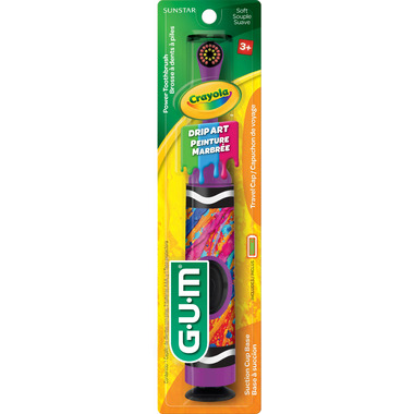 Introduce healthy habits with the GUM Crayola Power Toothbrush for Kids. Transform brushing into a fun experience your children will look forward to! With its battery-powered oscillating head and vibrant marker design, our toothbrush encourages building lifelong healthy habits. Batteries included, not replaceable or removeable. Ideal for children aged 3+, its compact head effortlessly reaches back teeth. Ultra-soft, oscillating bristles ensure gentle yet effective plaque removal, safeguarding against tooth decay. Equipped with a suction cup base that doubles as a cap, this toothbrush stores upright, keeping bristles clean and counters tidy.