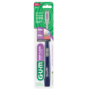 The GUM Deep Clean Sonic Toothbrush uses sonic motion and a compact brush head with soft tapered bristles to reach 45X deeper between teeth and below the gum line than a manual flat trim toothbrush.