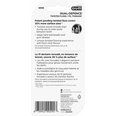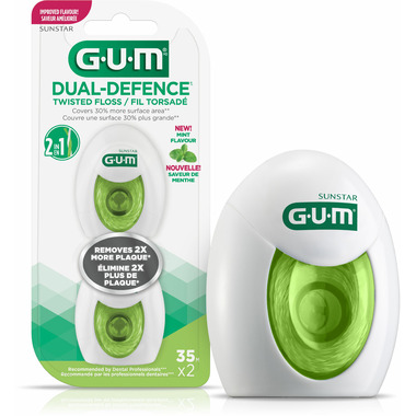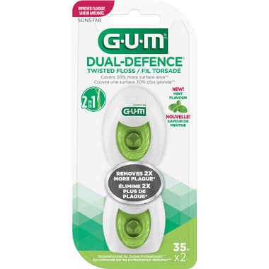 GUM Dual-Defence Twisted Floss promotes healthy gums, cleaner teeth, and fresher breath. Featuring two intertwined threads that effortlessly navigate between teeth, this dental floss ensures thorough plaque and debris removal with each use. The waxed floss leaves your mouth feeling clean after each application. Twisted Floss is proven to be twice as effective as standard floss, covering 30% more surface area*. The innovative dual thread design and convenient dispenser simplify daily flossing. By effectively preventing cavities, gum disease, and bad breath, GUM Dual-Defenceٙ Twisted Floss delivers your freshest, healthiest smile yet.