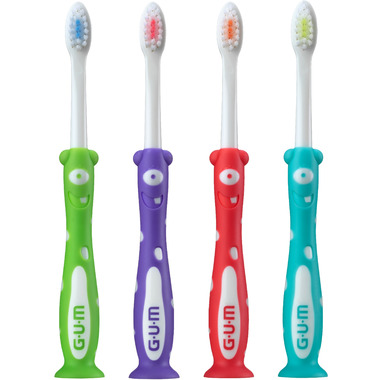 GUM Kids' Toothbrush, designed specifically for little ones aged 2 and up. With a small head and an easy-grip handle tailored to fit perfectly into small hands, these toothbrushes make dental hygiene fun and easy. With soft bristles in our DomeTRIM design, it offers gentle yet effective plaque removal, crucial for preventing tooth decay at this developmental stage. GUM toothbrushes come with a fun and functional suction cup bottom, allowing easy upright storage for cleaner bristles and a clutter-free countertop. Additionally, vibrant center bristles serve as a visual aid, teaching kids the correct amount of toothpaste to use, preventing over-exposure to fluoride.