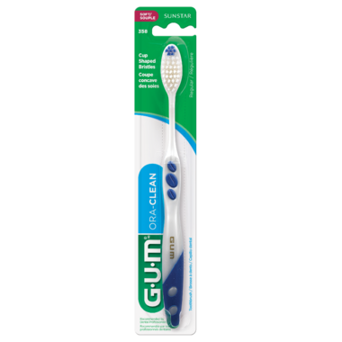 The GUM Ora-Clean toothbrush has a unique cup shaped bristle design that will follow the contour of your teeth, helping to remove plaque, preventing build up. Removing plaque helps to maintain a healthy gum line, preventing periodontal disease.