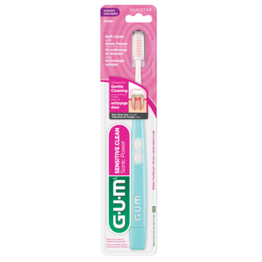 GUM Sonic Sensitive Clean battery-powered toothbrushes have soft bristles that penetrate deep below the gumline without causing pain or irritation. Perfect for use at home, or while traveling.