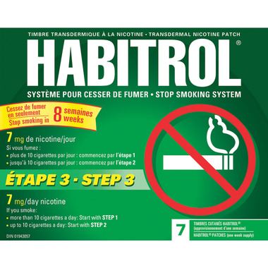 WHAT YOU GET: Each box of Habitrol Step 3, 7 mg Patches contains 7 patches, enough to last for 1 week. Do not use Habitrol for more than 8 weeks without consulting a doctor. Do not smoke, chew nicotine gum, or use any other form of tobacco product while using Habitrol. Do not use if you have had: a heart attack in the past three months, unstable or worsening angina (chest pain), severely irregular heart beat (arrhythmia), a stroke, in the past three months, skin diseases, known allergy to nicotine, adhesive tape, bandages or other ingredients in the patches, if you are pregnant or breast-feeding. Ask a doctor before using if you are taking other medications or have other medical conditions. Habitrol Step 3 is part of an 8 week stop smoking program, always read and follow the label*.