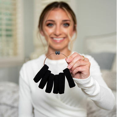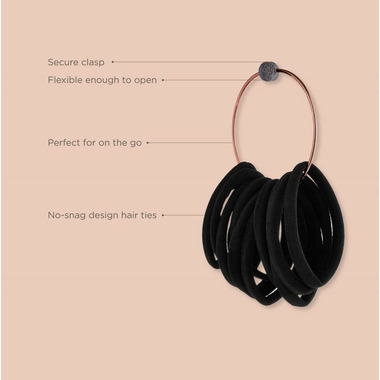 Their Better Together Hair Tie Holder allows you to store all your hair ties together in one convenient place. Great for on-the-go use. Includes 1 hair tie ring + 12 black seamless hair ties.