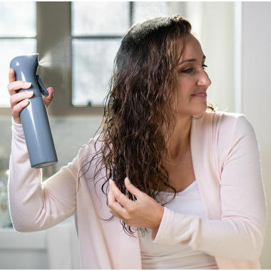 Their Mist Me Continuous Hair Spray bottle is a refillable water bottle that delivers a continuous, fine mist evenly to dampen hair.